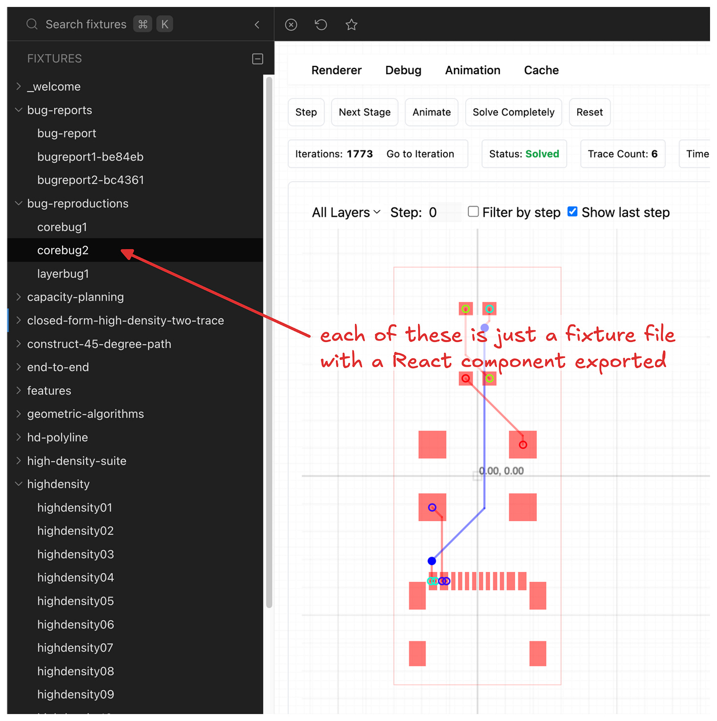 It’s nearly zero effort, just create `*.fixture.tsx` files that export a React component and you have a new page (remember, every Graphics Debug object can become interactive with the <InteractiveGraphics /> component from the graphics-debug module!)
